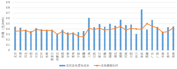 图1 光伏电站初始投资的构成 (2)运行维护成本 光伏发电的运维成本主要包括组件清洗、组件支架及基础维护、设备计划性检修、设备预防性试验等内容,不同地区的运维成本存在明显差异。据统计,目前我国光伏发电的运维成本在0.04~0.07元/W/年,未来运行维护成本基本保持稳定。 (3)其他成本 其他成本主要包括财务成本和税费成本。财务费用指融资所产生的相关费用及资金使用中产生的费用,与融资环境、政府政策相关也与建设期的长短及资金使用时间有关。税费方面主要是企业所得税和增值税。国家对新能源发电项目有一定的税费优惠。光伏发电项目可以享受企业所得税“三免三减半”的优惠政策。自2013年起实施了阶段性的增值税“50%即征即退”政策,但该政策已于2018年底到期,目前仍没有正式文件明确是否继续执行。 2. 2019年度电成本 采用2019年各省光伏发电实际利用小时数,计算了各省光伏发电的度电成本,与各省燃煤标杆电价的对比如图2所示。位于东北或西部地区的吉林、黑龙江、四川、青海、西藏、内蒙古的度电成本已经低于本省(区)燃煤标杆电价。另外,有8个省(区、市)的光伏度电成本高于燃煤基准电价不足10%,也将很快实现平价。需要说明的是,虽然一些省份光伏发电度电成本在全国已经处于较低水平,但是与当地燃煤标杆电价相比仍然没有实现平价。